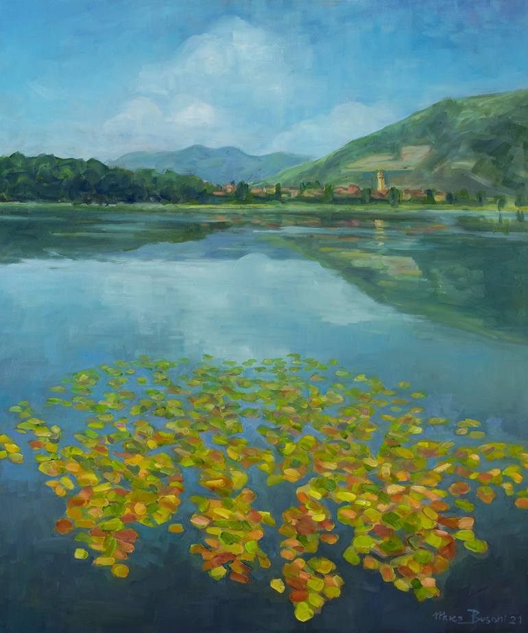 Plain air painting made on the green lake shore in a summer morning The artist played with the leafs floating on the water in the forgregound that slip from the landscape in an almost abstract pattern