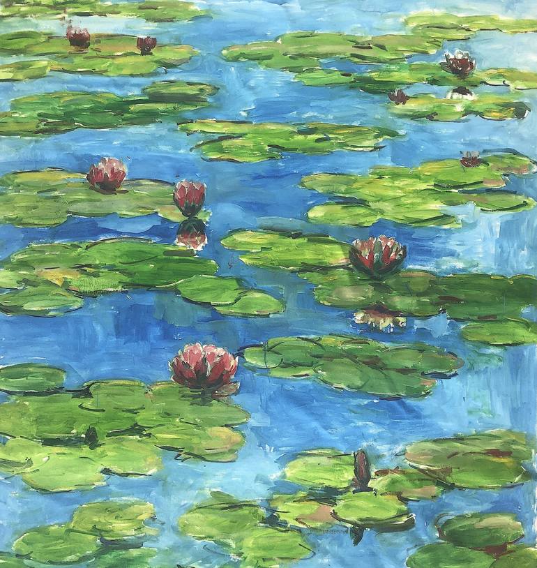 Needs frame to hang; heavy duty canvas will be rolled into sturdy tube for shipping. textured oil on canvas; water lilies painted in impressionist style