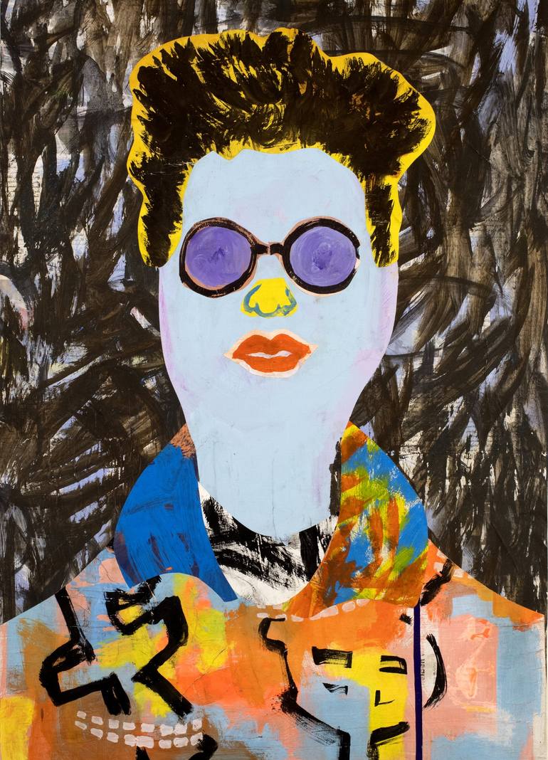 Talk show live - Lallu, guests and moderators introduce themselves with their portraits, as guest Babette Lallu, Original non NFT edition 2022 Technique: acrylic painting on newsprint - collaged on drawing paper 170 g/m², the image is protected with a thin acrylic varnish - paperplaining. The "paper...