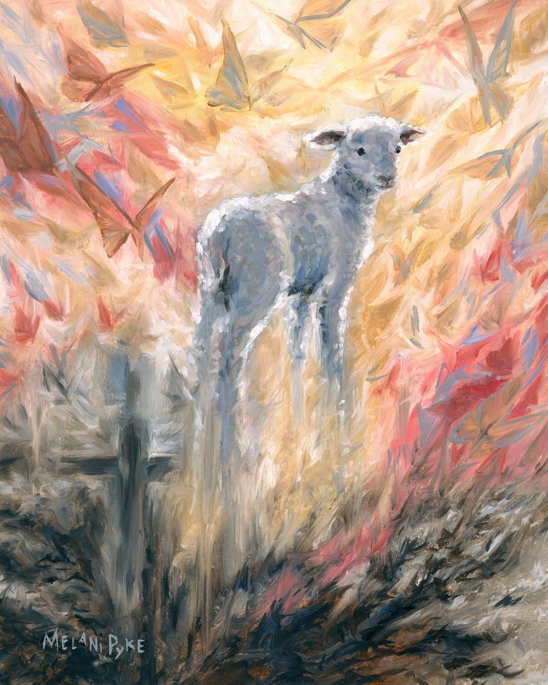 A warm and uplifting painting of a white lamb walking away from a broken ground of thorns into a cloud of butterflies. The lamb looks back as if to invite us to follow. Revelation 7:17 says, "For the Lamb at the center of the throne will be their shepherd; ‘he will lead them to springs of living wa...
