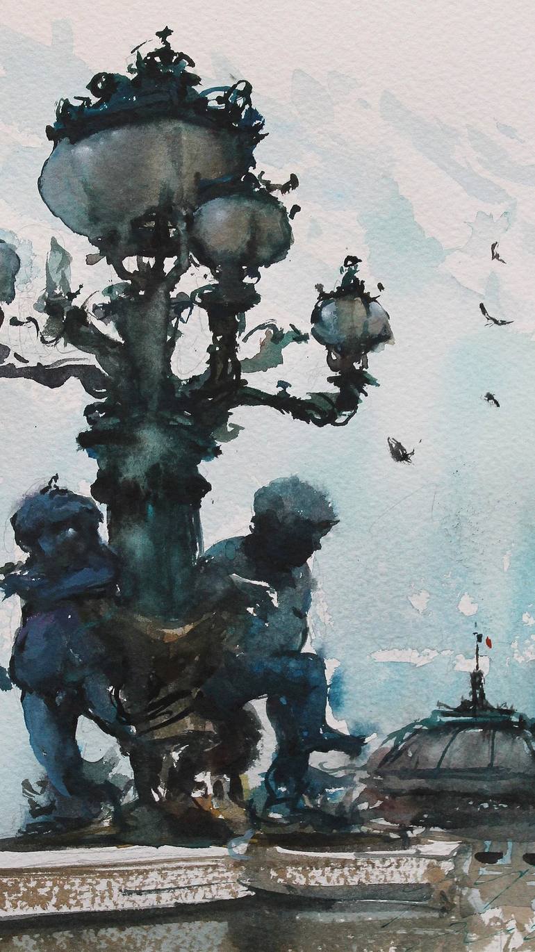 Original Watercolor on paper 11 H x 7 W inch. (29x19 cm) - Lamp Post Paris - depicts, the typical ornate Parisian Lamp Post on bridge Alexandre III, with bronze Art Nouveau sculpture Cherubs holding the lamps. The painting try to tell the flow of time on the Bronze, that get that fascinating green ...