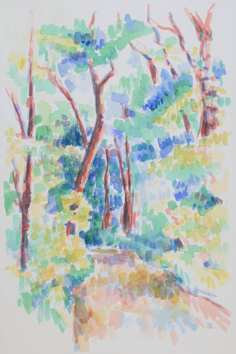An impressionist watercolor painting on white paper of a shady path in summer woods.