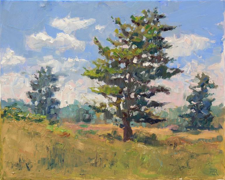 It's a calm and hot summer day, in a Midwest park . The painting is done with fast and pronounced brushstrokes on the spot, to capture the mood of the scene.
