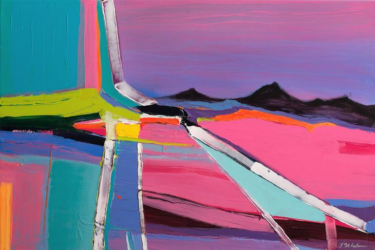In this abstract painting you can see landscape inspired by the views of Barcelona in sunset. The rod located between lavender fields and dark mountains in the background. I stylized the composition, simplifying the drawing of details in order to focus the viewer on the color combinations.