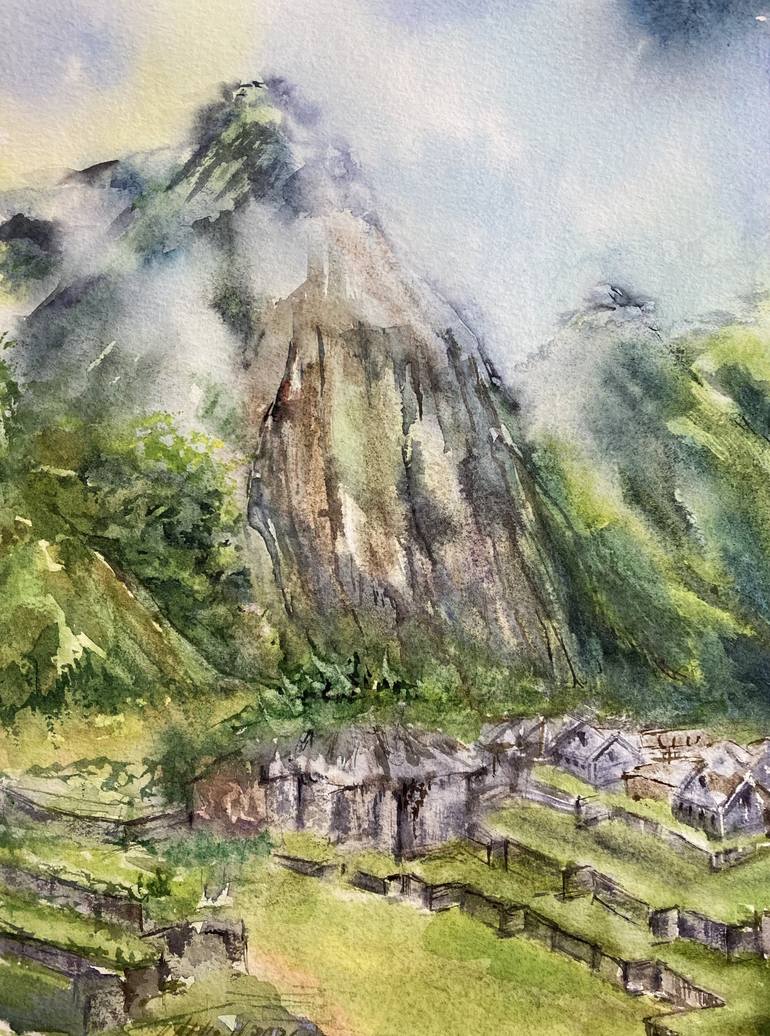 Machu Picchu . Watercolor original painting . In this watercolor painting, I sought to capture the ethereal beauty and timelessness of Machu Picchu, the ancient Incan citadel nestled high in the Andes. The composition highlights the dramatic interplay between light and shadow that defines this iconi...