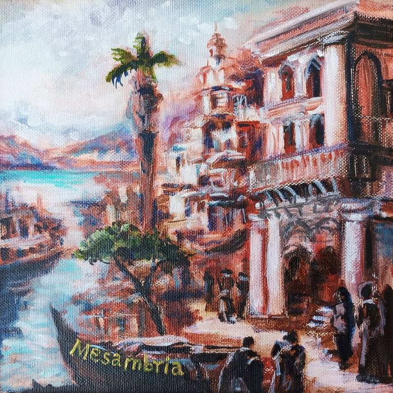 Transport yourself to the ancient world with this captivating oil painting, offering a glimpse of a quaint harbor in an ancient town nestled within the Roman Empire. This small yet evocative artwork portrays a charming view of a historic street adorned with distinctive architectural elements, inviti...
