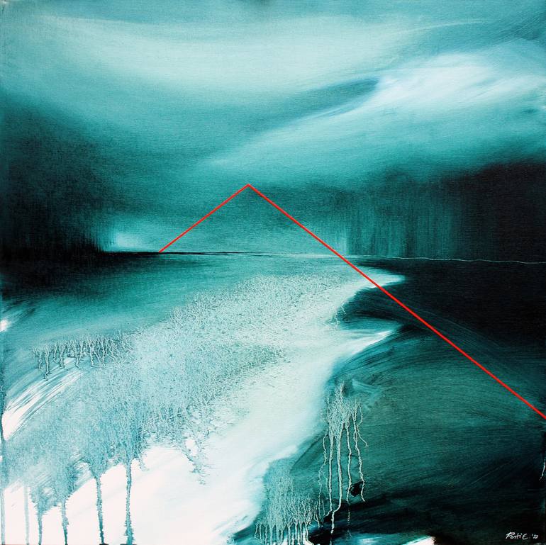 "Landscape Resonance I" is an abstract landscape painting that showcases the artist's exploration of abstraction and expressive gestures. The dominant teal tones imbue the artwork with a sense of tranquility and depth. A bold geometric red line intersects the canvas, adding a dynamic visual element....