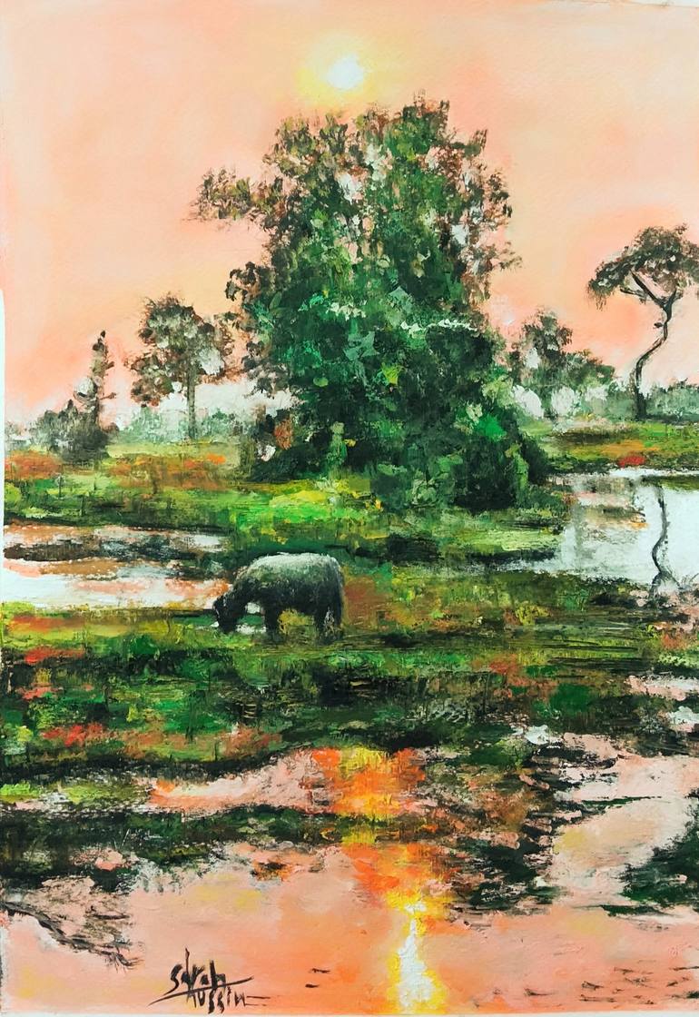 It's an original painting of a green landscape with a white sheep and the gentle reflection of the sun on the pond.