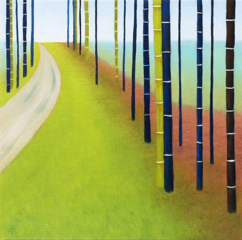 Landscape with blue and green bamboo trees. Deep edge linen, sides painted white and ready to hang.