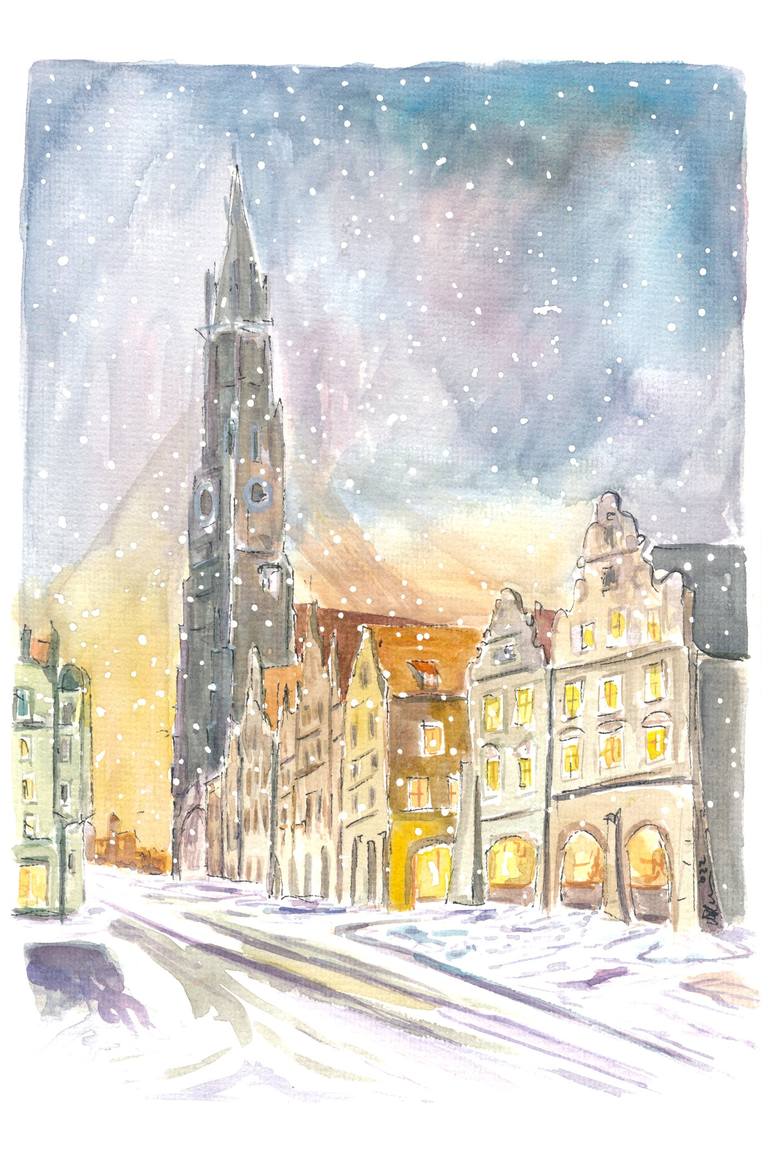 Landshut Altstadt Snowy Winter Scene with Saint Martin Basilica - watercolor on paper
