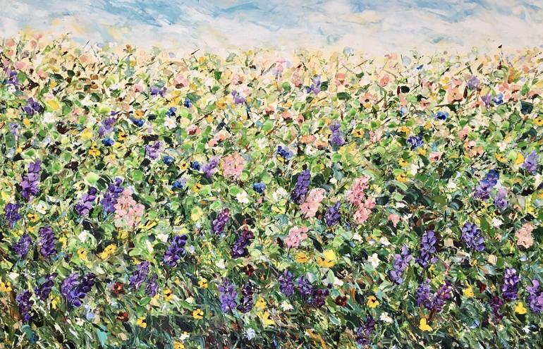 Large Lupine Flowers Impasto Oil Painting On Canvas *Title: „Field of lupines“ *Size: 48"x32" [120x80 cm] *Original handmade oil painting on canvas by brush and palette knife. *Made by me - Vilma Gataveckiene. This is not a copy or a print. *Signature on the front and on the back. ...