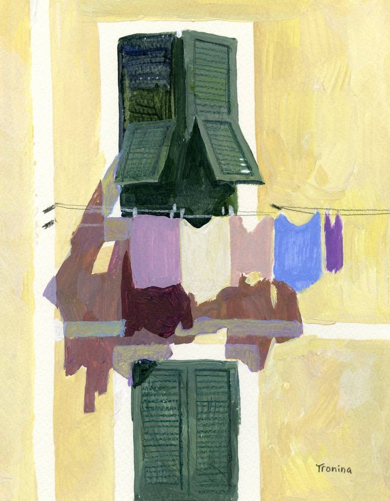 The painting shows colorful clothes hanging to dry on a window in Italy. The contrasting colors of the clothes, illuminated by the sun, are in harmony with the shady shutters. The calm and peaceful atmosphere of the place gives the viewer the feeling of being in this moment of daily Mediterranean li...