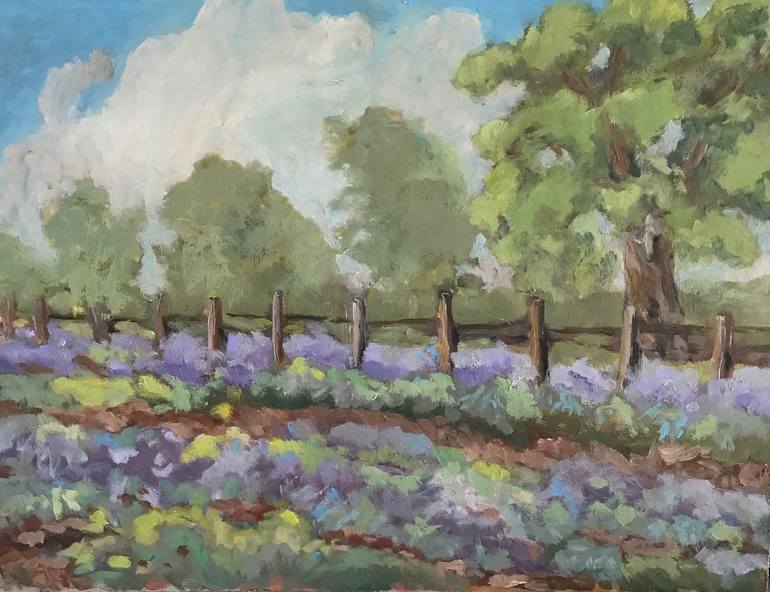 I was inspired to paint this beautiful landscape of a local lavender farm in full bloom. Lavender blooms in early June here in the Blue Ridge Mountains of Virginia. Summer breezes move the trees and their foliage contrasts with the beautiful purple blooms. I can smell the scent of summer.