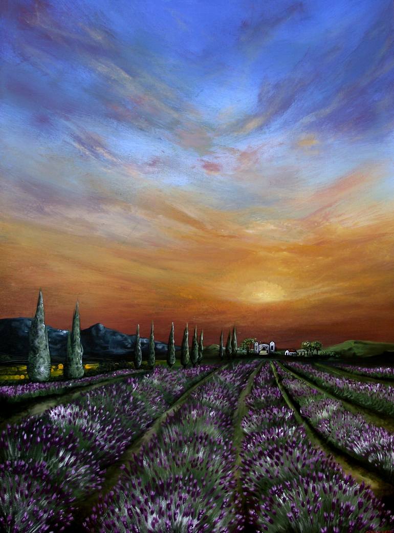 I'm always inspired by a magnificent sunset. This painting came about when I was on the road to a little town in the karoo called Barrydale. We passed the most spectacular lavender fields just as the sun was setting. I got an idea from there to try and reinterpret what I saw. I needed a vast area...