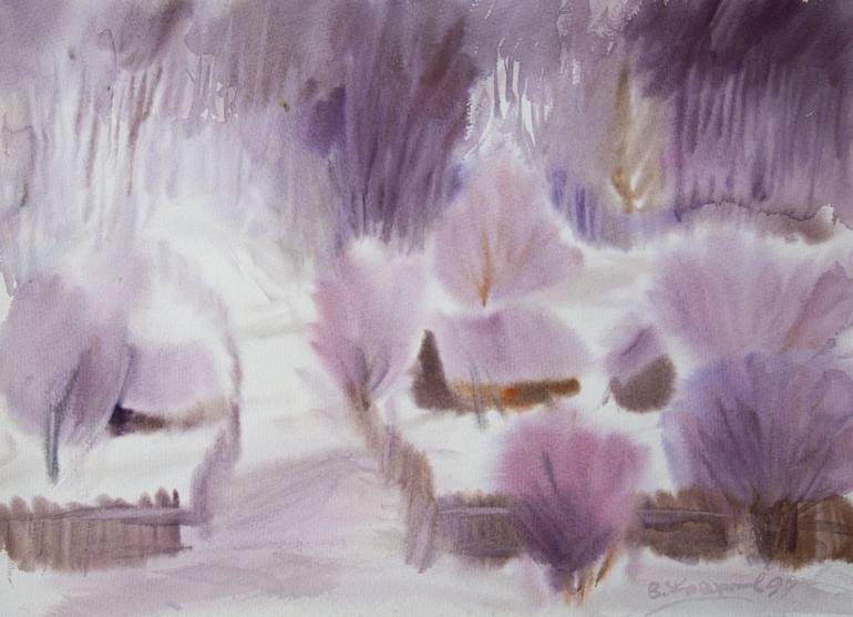 This evocative watercolor painting captures the serene beauty of a winter landscape, cloaked in soft lavender and pastel tones. With its dreamy, impressionistic style, the work invites viewers into a tranquil world where nature merges with abstraction. Gentle washes of color and delicate brushwork e...
