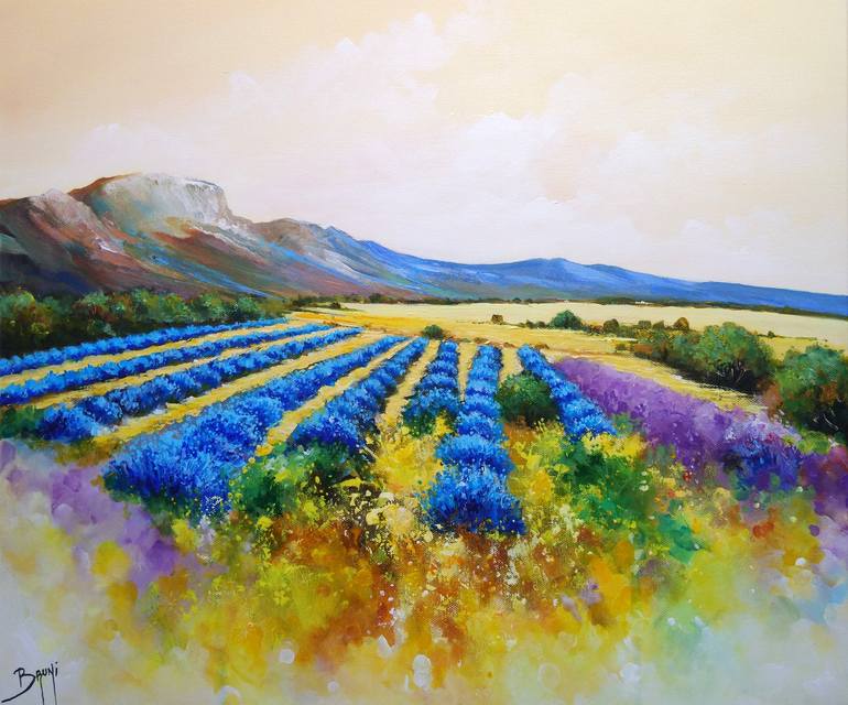 Immerse yourself in the sweetness of Provence with this painting on canvas. The lavender fields, of an intense purple, extend as far as the eye can see under an azure sky. The warm and enveloping light invites you to dream and relax. An ode to the simple and authentic beauty of nature.