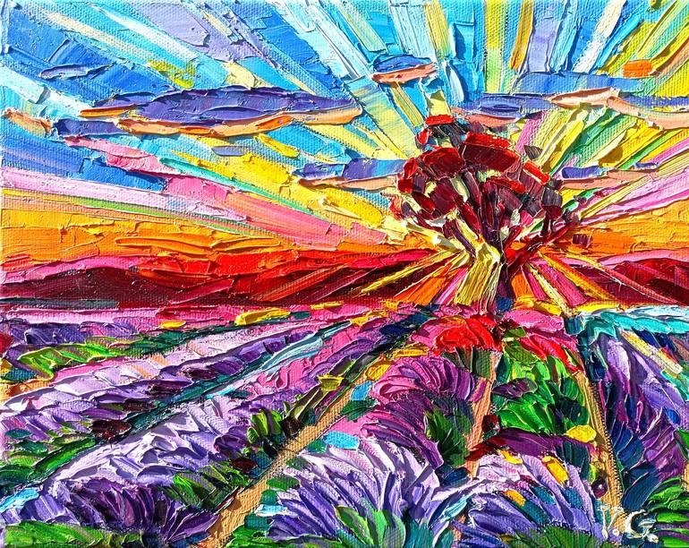 Beautiful 24/30 cm. landscape with lavender camps , enchanting with the illuminating and materci colors, which can seem alive. A very colorful painting by Vanya, which confounds the colors even on small sizes. Her unmistakable technique, indisputable mastery ... Give yourself a piece of joy ! Each o...