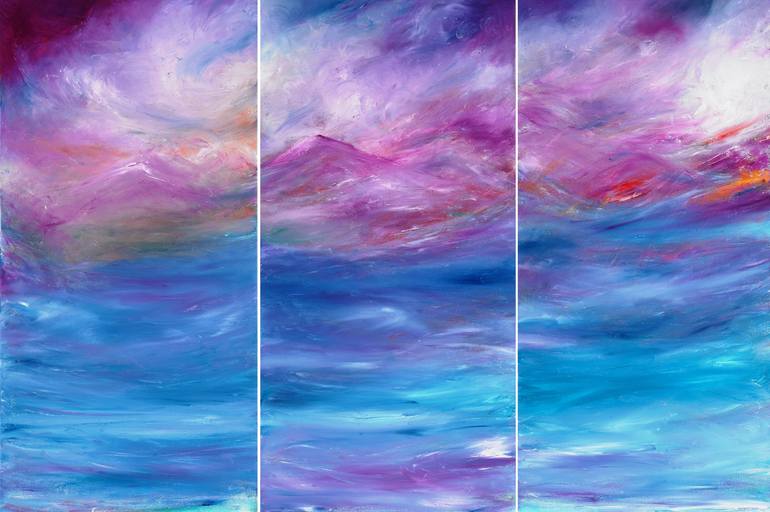 Inspired by the old masters and the new modernists, Wendy White paints the lofty heights of earth, sky and water to the sounds of music. Enjoy the transcendant heights of this beautiful oil on canvas triptych,