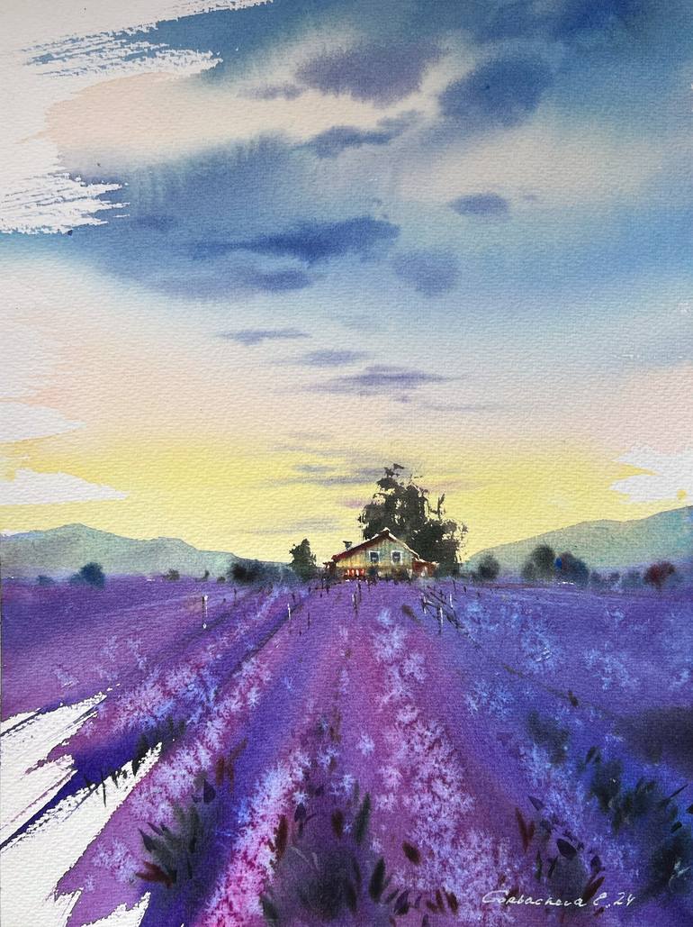 Bring a touch of the countryside into your home with this captivating artwork showcasing a lavender field, a cozy house, and a setting sun. Original watercolor painting Medium: Watercolour on Paper Saunders Waterford 300g One of a kind artwork Size: 31 x 23 cm / 12 x 9 in Signed on the front Subje...