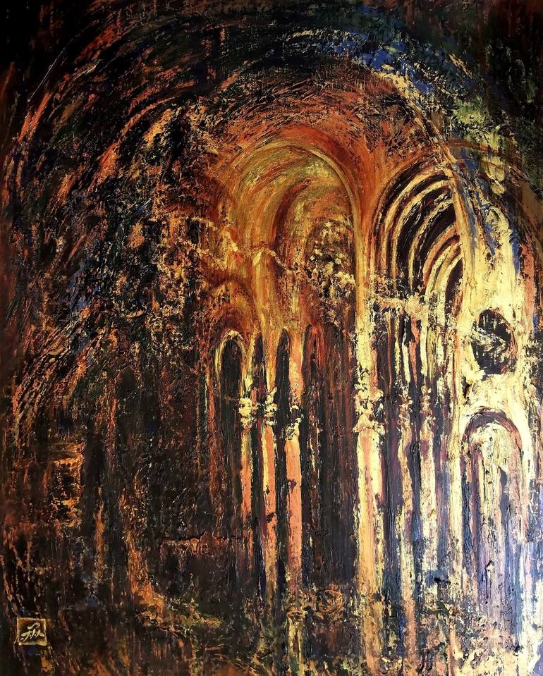 Immerse yourself in the mystique of “Le Temple des Chimères,” an extraordinary oil painting on linen canvas (80x100 cm) that conveys the grandeur and enchantment of an ancient, otherworldly temple. With dramatic arches and textured brushstrokes that create a fluid sense of movement, this artwork sea...