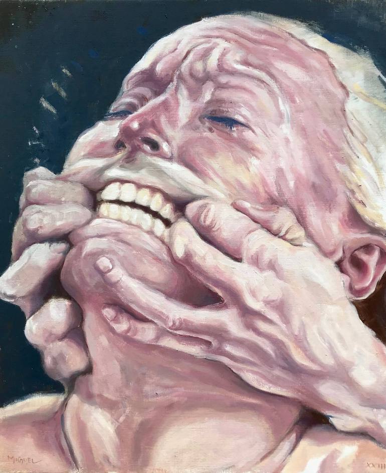 Portrait d'une femme se faisant écarter les lèvres par une autre personne. Au vu de son expression, ça n'a pas l'air d'être très agréable.