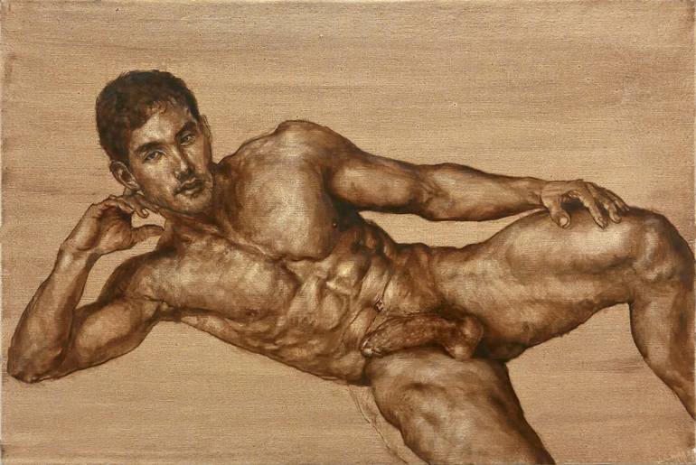 This oil painting of a reclining male nude is inspired by ancient Greek athletes and Roman bronze statues.