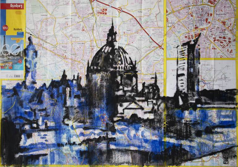 Original painting on real map of Leipzig. Not stretched
