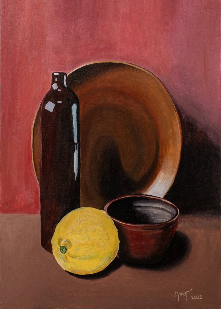 This painting is a contemporary still life that celebrates the quiet beauty of everyday objects. A dark glass bottle, a rustic ceramic bowl, and a large plate create a harmonious composition, while the bright yellow lemon adds contrast and vibrancy. The deep warm tones and careful play of light and ...