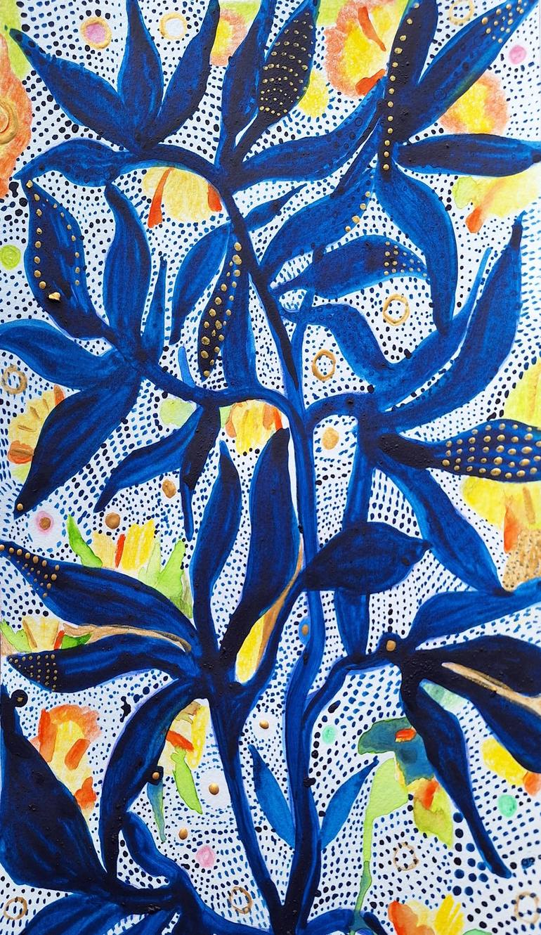 Acrylic, watercolor,ink and pencil on acid free paper. This picture is a part of my botanical abstract series.
