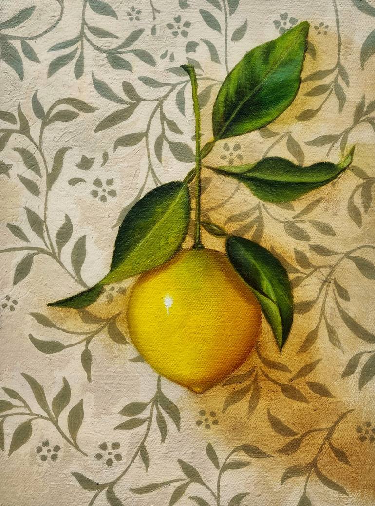 Name- Lemon on a Branch Medium- Oil on Canvas Sheet Artist- Priyanka Singh Size- 6 x 8 in Lemons are often considered a symbol of Longevity, Purification, Love and Friendship. This fruit is often liked to Fidelity. This painting is on good quality medium grain canvas and will ship un stretched. It ...
