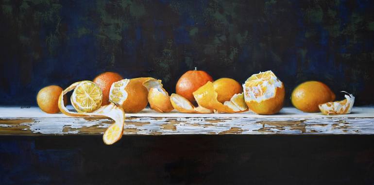 This still life oil painting captures the quiet drama of peeled citrus fruits resting on a weathered wooden surface. The rich textures, warm colors, and the contrast of bright oranges against a dark, moody background invite the viewer to pause and reflect. A meditation on impermanence, freshness, an...