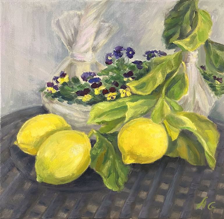 Still life_oil on canvas_framed I painted this still life on a sunny day. Drawing fruits from nature is a great pleasure for me. The flowers on my balcony are ideally suited as a backdrop for bright and shiny lemons. framed on lith wood proaessional frame