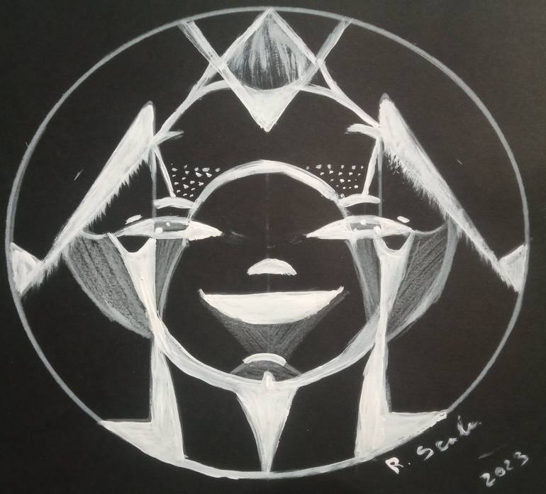 Leonardo sun painting and white mattia on black cardboard with green passepartout ethnic mask lucky charm unique magnetic symbol available handmade rigid shipping painting size 25 x 25 with passepartout 30 x 30 cm work signed by Roberto Scala with certificate of authenticity