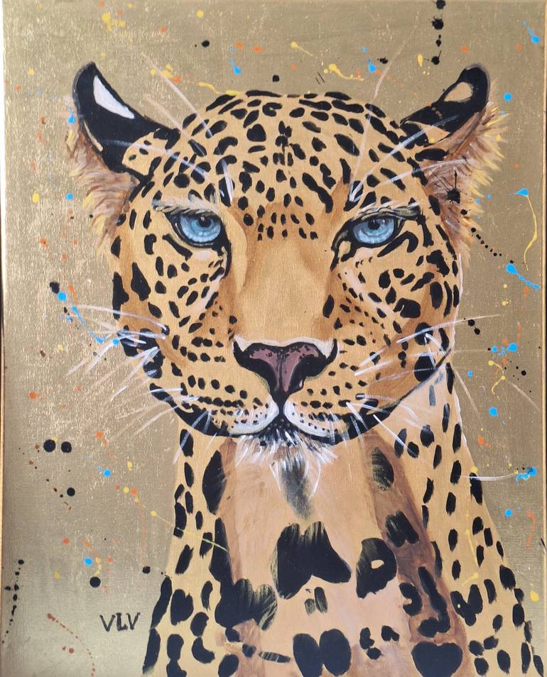 Leopard. Acrylic Painting on Canvas. Original artwork. I covered the background of the painting with gold leaf. The drawing is made with gold metallic acrylic. Painted with brushes . This is a trendy popular pop art painting. This picture will look beautiful in a living room,bedroom, dining room, o...