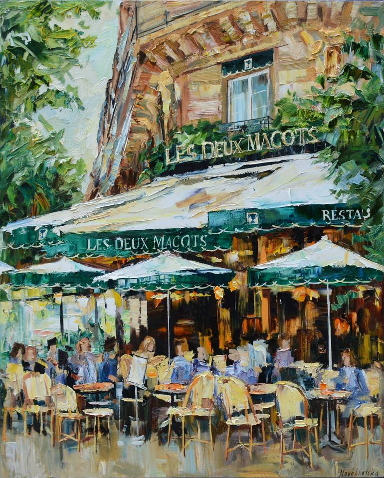 The subject of Deux Magots, the famous Parisian cafe was a great inspiration for me. I pay particularly attention in this piece to the treatment of light, and the strong contrasts between the dark shadows and warm, golden light. I work in my personal expressionist style, creating a rich textures on ...