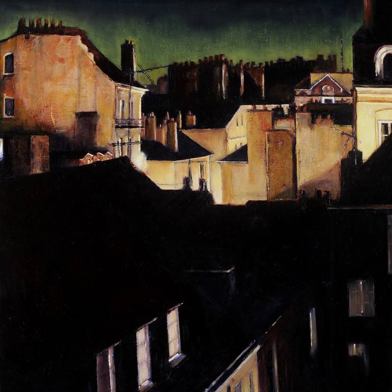 “Les Toits de Nantes” takes our eye right out across some of the historical French town's oldest buildings. It is the evening, when the yellow lamplight bathes the buildings turning them into glowing monuments, throwing the rooflines into silhouette and now and again highlighting the edge of a terr...
