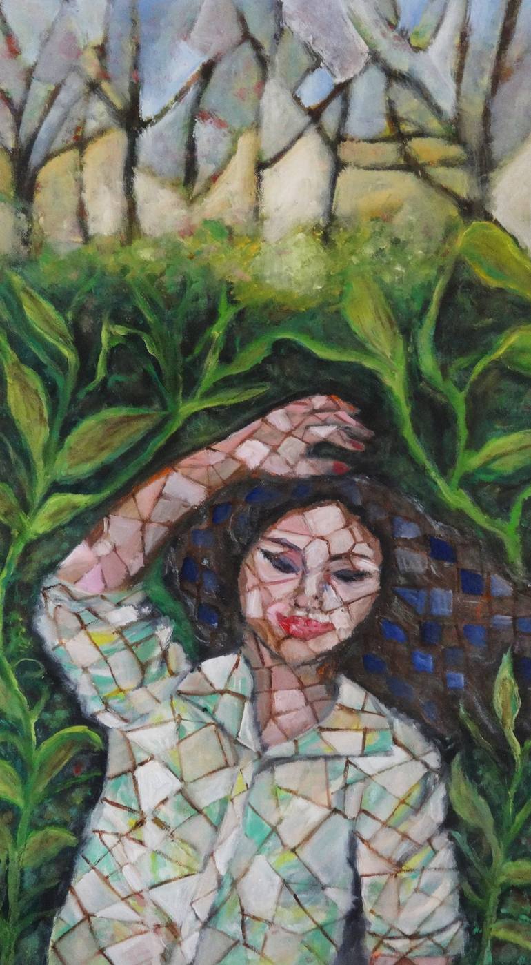 This stunning oil painting beautifully embodies the tranquility and harmony found in nature. It depicts a woman reclining among vibrant greenery, her face glowing with peace and satisfaction as she immerses herself in the natural world. The backdrop is adorned with lively trees adorned with red blos...