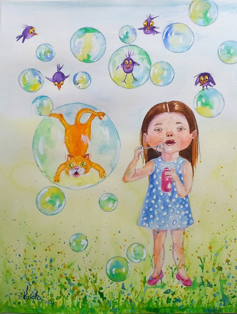 --- Let"s play and blow bubbles. If you get a big bubble, don"t worry, it"s soapy and harmless. Let"s just play together. --- This unique and exclusive watercolor painting, hand painted on 300gsm 100% cotton watercolor paper. --- Picture is signed on the front and signed and dated on the...