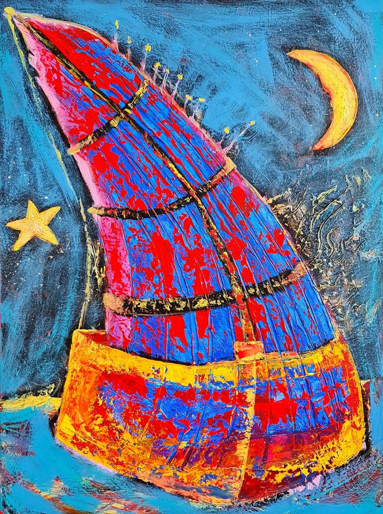 Handmade painting acrylics and modelling paste on a stretching canvas with the dimensions of 60x80cm inspired by the quotes “The moon will guide you through the night with her brightness, but she will always dwell in the darkness, in order to be seen.” – Shannon L. Alder