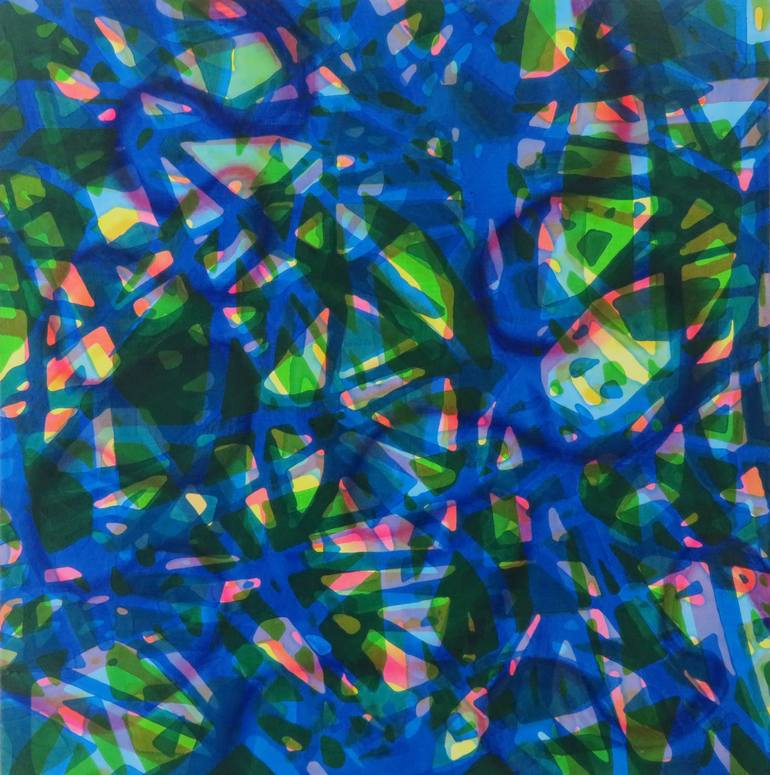 Alone in my studio, I want to communicate my strong connection to nature. I get my inspiration through my walks in the forest. I am fascinated by the intertwining of branches, the delicacy of their laces, the color of the sunshine through the leaves in the forest. I use colors in acrylics or watercolors, on paper, wood or canvas. I enjoy creating new colors by accumulation, saturation and numerous layering of different colors. I build my paintings with multiple applications of washes on the surface. Shadows and lights play with transparency and saturation of colors. Sometimes the eye can enter in the depth of the light of the painting or sometimes it stays on the surface, blocked by dark intense hues. One can perceive the light filtering through the forest or shining on the surface of a river. The vibrations created, the tonal strength and the harmonies give some impression of music. In the end, each color is connected with the ones around to invent some kind of symphony for the eyes. Each painting bears the next one. I build a new painting from what I read in the one just finished and the result of the following one is unpredictable. I like the tension of not knowing what the result will be, I like to surprise myself… Crossroads of colors, aerial views of some ancient cities, organic forms cover the surface of my painting weaving links from right to left, from up and down creating a web similar to those social links that keep us connected to one another. I like to think that my paintings are also some kind of music for the eyes… I live and work in Quebec City where I received a BFA in visual arts from Laval University. I have attended many formations through out the years to improve my knowledge in arts. My works have been showed in many solo exhibitions in Quebec and I have been invited to participate in various group exhibitions in Quebec and abroad: Cuba, Scotland, France, Ireland, Belgium, Poland and Germany. One can see my art in private and main public collections: Loto-Québec, Desjardins, Pratt&Whitney, Vestey Group of London, Bibliothèque et Archives nationales du Québec, Library and Archives Canada.