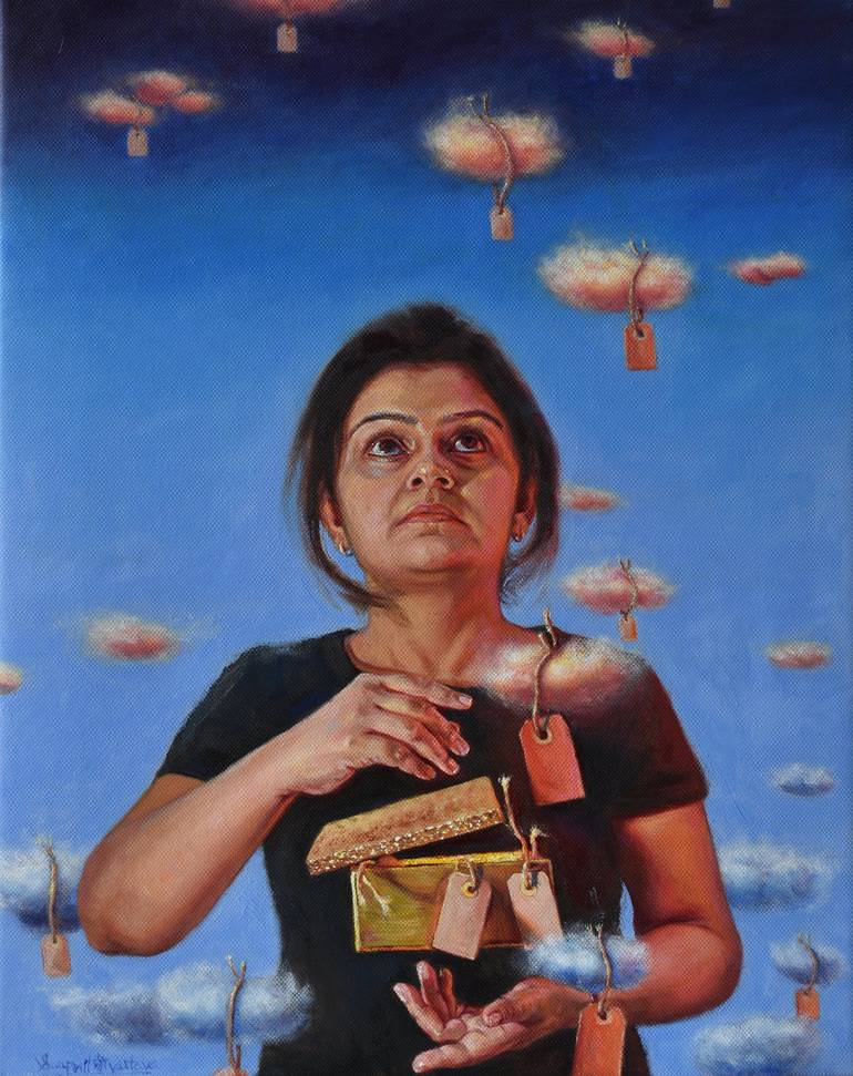 In this self-portrait, I’ve tried to remove any specific identity, representing the shared experience of exploring the “unknown box” of life. This box is filled with surprises—moments of gain and loss. The happy moments are like a gentle breeze, lifting the clouds of our memories high into the sky. ...