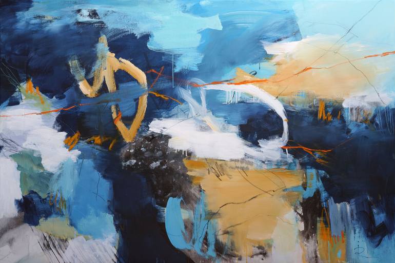 Materials: Stretched canvas, Acrylic and Oil Pastel Sides: Painted as a continuation of the motif Frame: Unframed, further framing possible but not necessary. Varnish: Silky finish with UV protection Signature: Front and verso, also signed Certificate of Authenticity The work will be shipped stretch...
