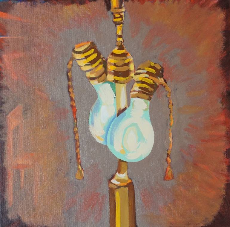 Bare bulbs on an antique light fixture presented a challenge to me, as I searched for the color that would appear like bright light against the dark room in the background. It turned out to be a pale mint green against brown. Sides are painted black. Would look good in a wide gold frame. Unframed, w...
