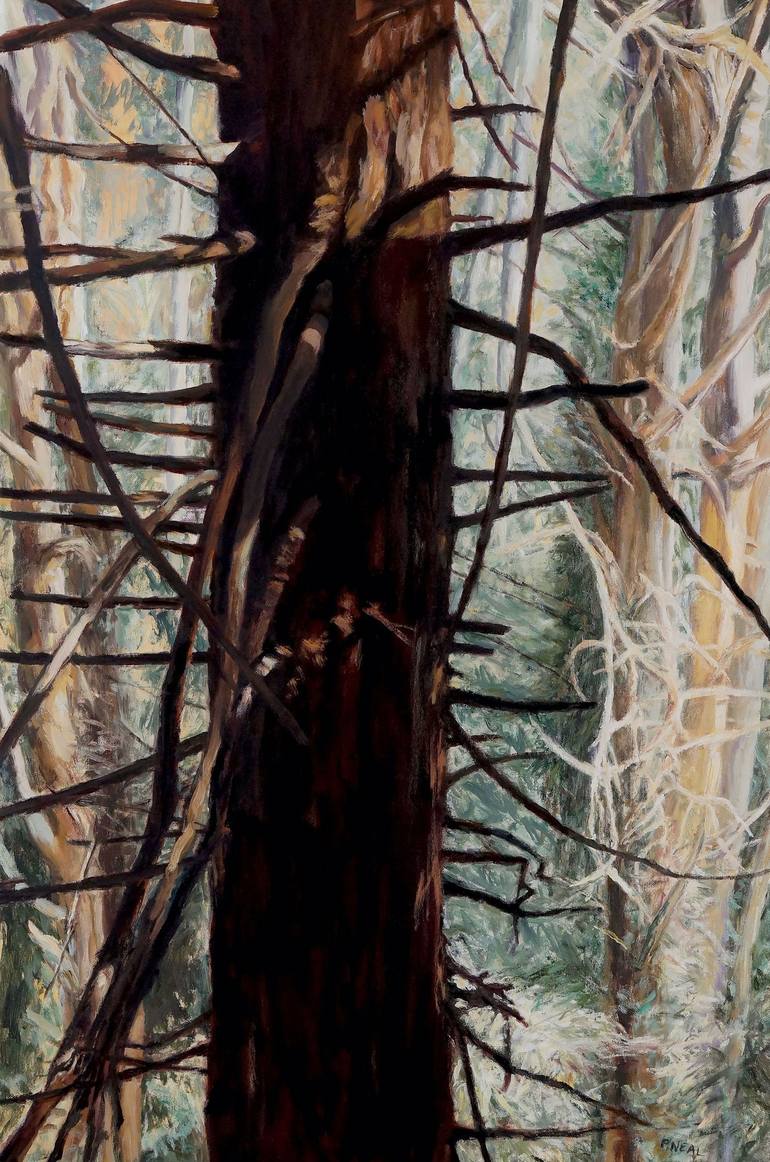The tree in the foreground is a barbed figure, stretching out its bare branches to repel or to invite. It's a geometric form that gathers all the painted elements together.