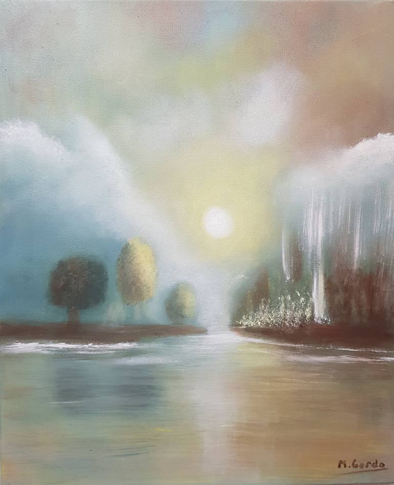 Oil on canvas This captivating piece captures the poignant moment of dawn in a forest. Through masterful use of light, the artist portrays a scene where the sun struggles to break through clouds and mist, casting its rays upon the water’s surface. Dominated by hues of blue and green, the canvas sugg...