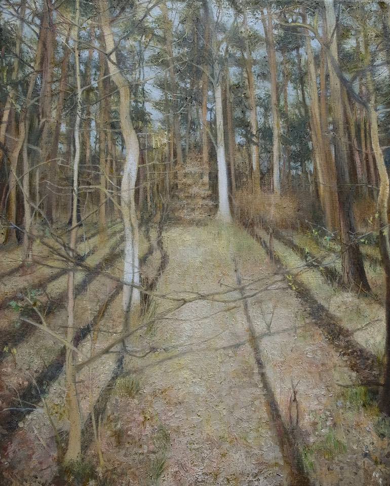 Three layers of Landscape. Figuration and Dissolution. Gray's paintings are superimpositions of three forms of landscape: agricultural/industrial landscapes, urban landscapes such as labyrinths, stations, and transitional spaces, and inner psychological or soul landscapes. The superimpositions, dissolutions, and shifts of the boundaries of these landscapes allow for possibilities of reconnections, such as memory reconstruction or the reprogramming of the self. One senses that the moment in which this painting was created was a ceremony, and this ritual presence is still present in the relic, the canvas. Different aspects of life, such as beauty, horror, and absurdity, are synthesized through the compositions into a mood, a meaning, through which the insight shimmers that we control nothing but influence everything.