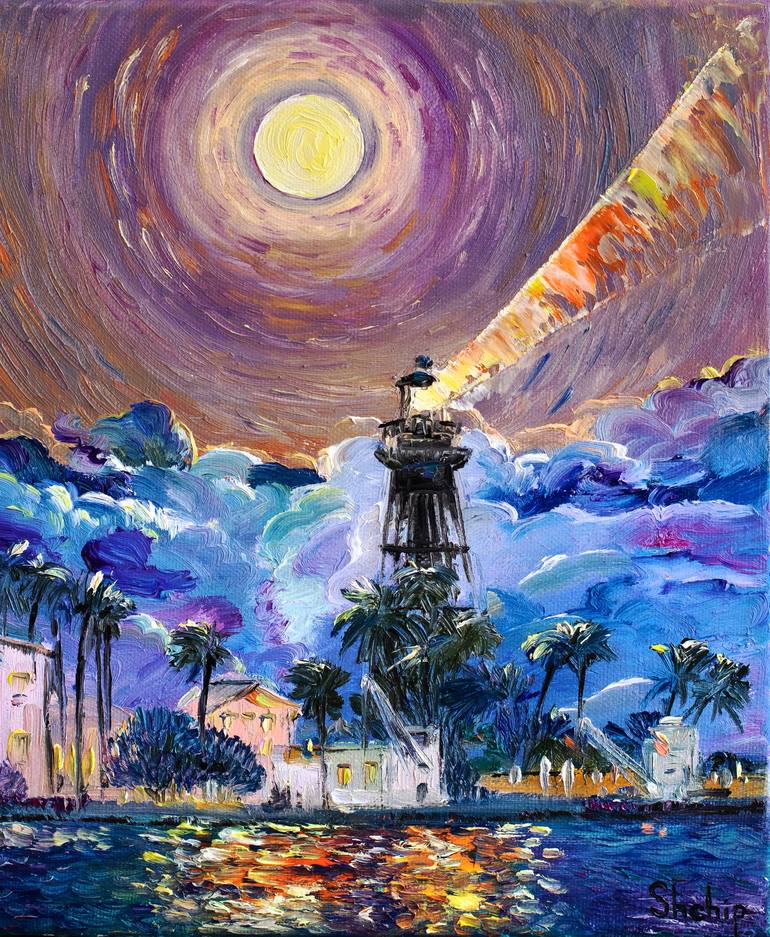 This oil painting depicts a picturesque coastal scene at night. A large moon dominates the sky, casting its light on the sea and the land. A tall lighthouse stands by the coast and its beam of light piercing the darkness. Also a small harbor can be seen. A row of houses with white walls lines the s...