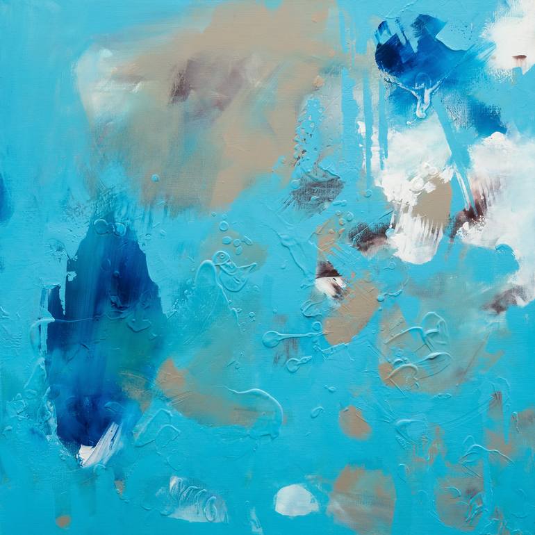 "Like this"painting is a very positive artwork in 90x90 cm size on a high quality flax canvas, 2 cm side (sides are finished with colours from the painting). The bright and happy mood of the painting is composed with rich colours such as turquoise, blue, beige and white. It will looks especially goo...