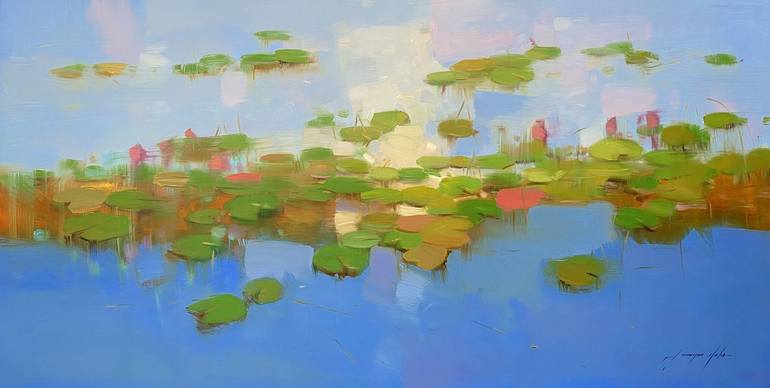 Artist: Vahe Yeremyan Work: Original Oil Painting, Handmade Artwork, One of a Kind Medium: Oil on Canvas Year: 2021 Style: Impressionism, Subject: Lilies, Size: 24" x 48" x 1'' inch, 61x122x3 cm, Unframed, Stretched on Wooden Bar, Gallery Wrapped, Ready to Hang. Yeremyan is an Armenian nativ...