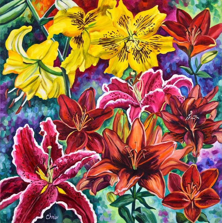 Painted on-site in the artist's garden in Minneapolis, MN. Features a variety of exotic lily flowers in full bloom including magenta with white edges, orange with dark centers, red with yellow tips, and crowned with golden yellow tiger lilies with curling petals. The flowers were painted with brus...